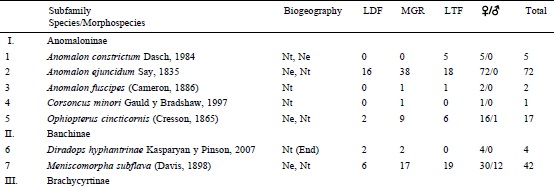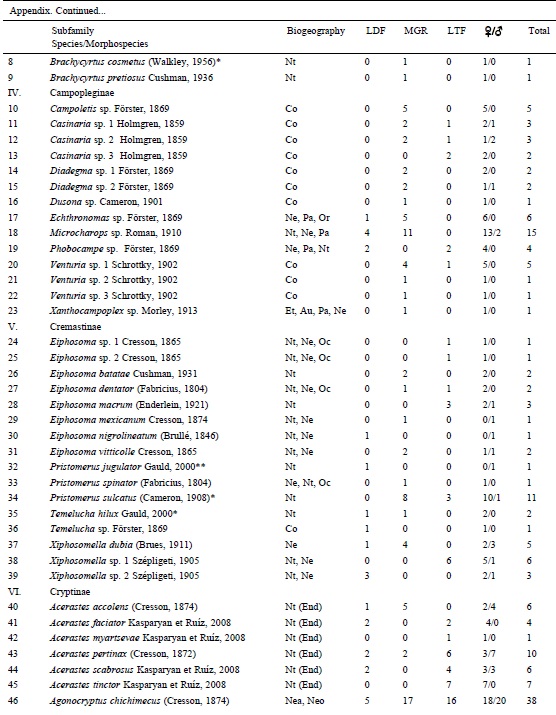 Taxonomic determination was carried out using the relevant keys (Brambila, 1997; Dasch, 1979, 1984, 1988, 1992; Gauld, 1988, 1991, 1997, 2000; Gauld et al., 2002; Heinrich, 1977; Kasparyan & Ruíz-Cancino, 2005, 2007, 2008a, 2008b; Khalaim & Ruíz-Cancino, 2012; Reshchikov; 2011; Townes, 1969, 1970a, 1970b, 1971; Townes & Townes, 1978). The specimens that did not match with the morphological features of a described species were regarded as morphospecies. All insects were deposited in the collection of Instituto Tecnológico de Ciudad Victoria, Tamaulipas, Mexico.
