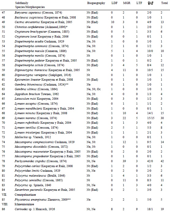 Finally, with the new records for Mexico and Tamaulipas presented here, knowledge about the geographical distribution of some species has been extended. Based on this, 1,306 species of Ichneumonidae fauna are now registered for Mexico (Ruíz-Cancino, 2015) and 417 species are reported for the state of Tamaulipas (Ruíz-Cancino, 2010).
