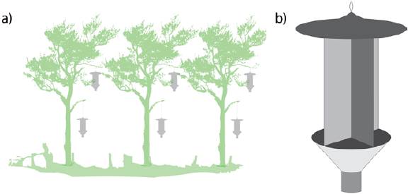 El muestreo se realizó en 2 sitios con BTSc, separados entre sí aproximadamente por 2.54 km medidos en línea recta. En cada sitio se instalaron 6 trampas de intercepción de vuelo distribuidas en 3 puntos (Fig. 1a). En cada punto de muestreo se colocó una trampa en el dosel (entre 9 y 12 m de alto) y una en el sotobosque (a un metro de altura). La distancia mínima entre los puntos de muestreo de un mismo sitio fue de 120 m.