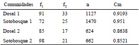 Se calculó la completitud de los inventarios mediante la cobertura de la muestra (Cm) cuyos valores tienen un rango de 0-1 expresado en porcentaje, este mide la proporción del número total de individuos en la comunidad que pertenecen a las especies representadas en la muestra (Chao y Jost, 2012). También se realizaron curvas de extrapolación de especies usando como unidad de esfuerzo el número de individuos del muestreo (Pineda y Moreno, 2015). La comparación de los valores de riqueza específica se realizó estandarizando a un mismo número de individuos. Para ello, en este trabajo se tomó la alternativa propuesta por Colwell et al. (2012), la cual permite extrapolar, mediante métodos no paramétricos, las curvas de acumulación más allá del esfuerzo de muestreo invertido en el estudio. Para la riqueza estandarizada a un mismo número de individuos se calcularon intervalos de confianza al 84%, que mimetizan de manera robusta pruebas estadísticas con un α = 0.05, y por lo tanto determinan si existe diferencia o no en la riqueza acumulada, dependiendo de si los intervalos se traslapan (MacGregor y Payton, 2013). Para generar las curvas de acumulación de especies y extrapolación se utilizó el programa EstimateS v.9.1 (Colwell, 2013).