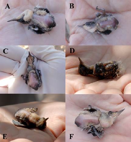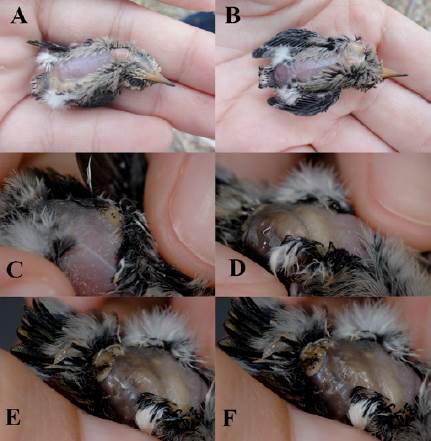 Las larvas de moscas parásitas encontradas en los 3 nidos se identificaron como P. bellus. Las primeras larvas se observaron en 2 crías de C. latirostris el 13 de marzo de 2012. Estas crías presentaron el mayor número de larvas (7 y 9, respectivamente). Posteriormente se encontró el nido de C. auriceps con 2 crías (3 de abril de 2012), ambos presentaron larvas, aunque en menor número (5 y 4 larvas). Así mismo, el nido de A. rutila presentó 2 crías, sin embargo, solo fue posible examinar a una de ellas cuando salió del nido (30 de marzo de 2012), evidenciándose la presencia de 4 larvas. Se monitorearon las crías de las 3 especies hasta que dejaron los nidos (A. rutila y C. auriceps) o murieron (C. latirostris). En todas las crías de colibríes estudiadas, la zona del vientre y el área cloacal son los sitos donde se encontró el 70% de larvas, mientras que el 10% de las larvas fue encontrada en el área de la garganta y el restante 20% con larvas distribuidas entre las alas y costados del cuerpo (Tabla 1, Figs. 1, 2).