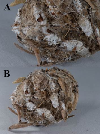Cuando concluyó el monitoreo de los nidos (sin uso evidente de la hembra y ya sin la presencia de las crías), éstos fueron recolectados debido a que cuando las larvas dejan al huésped, pupan en la base del nido (Fig. 3). En este tipo de muestreo, se recolectaron 15 pupas en los nidos de A. rutila, 15 de C. latirostris y solo 9 de C. auriceps. En los nidos depredados durante la incubación o abandonados por las hembras durante la construcción no se observaron pupas.