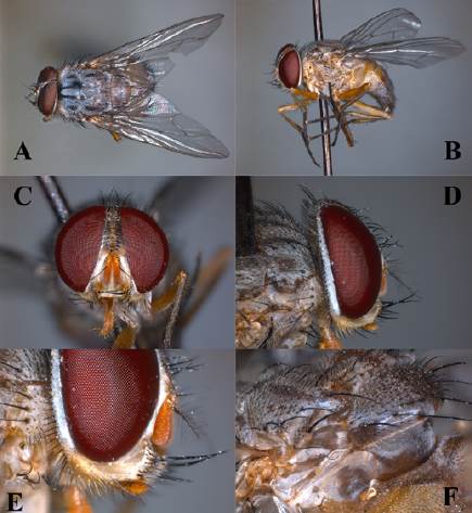 Se recolectó una larva la cual pesó 0.062 g y midió 10.2 mm de longitud. El color es beige con espiráculo oscuro. El cuerpo se observó segmentado. Por su parte las pupas son de forma cóncava con el espiráculo oscuro. La pupa se encuentra inmersa en un capullo espumoso blanco (Fig. 3). En promedio, el peso de la pupa fue de 0.048 ± 0.006 g y sus medidas fueron 9.75 ± 0.98 mm de largo y 3.74 ± 0.32 mm de ancho. El tiempo que tardan en emerger los adultos es de 5 a 8 días. Finalmente, el adulto de P. bellus se caracteriza por la pilosidad color amarillo naranja en las mejillas y las cerdas que presenta en la pared postalar, además de la lejanía de la vena M del ápice alar y los palpos color amarillo naranja (Fig. 4).