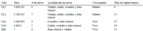 De las crías que presentaron larvas, únicamente las de C. latirostris murieron, las crías de A. rutila y C. auriceps llegaron a volantones y salieron del nido.