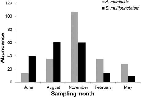 Both species occurred in almost the same sampling points but in Acahuapa-Lempa (sampling point 1), A. monticola occurred alone (Fig. 1). Agonostomus monticola occurred in 8 (47%) of the 17 sampling points, 4 in the main channel and 4 in the tributaries. In total, 222 fish were recorded during the 5 sampling events, with higher abundance in November (Fig. 2). The fish were collected from 19 to 325 m asl and fish abundance in the main channel was lower (38%) than in the tributaries (62%) decreasing with the altitude (Table 1). The average standard length for the total of individuals of A. monticola was 6.54 ± 2.97 cm. While larger fish were found at higher elevations (r = 0.20, t = 3.0649, df = 219, p = 0.0025), the population length structure of the A. monticola in the main channel and the tributaries did not differ (Kolmogorov-Smirnov GOF = 0.1376, p = 0.2334) (Fig. 3).