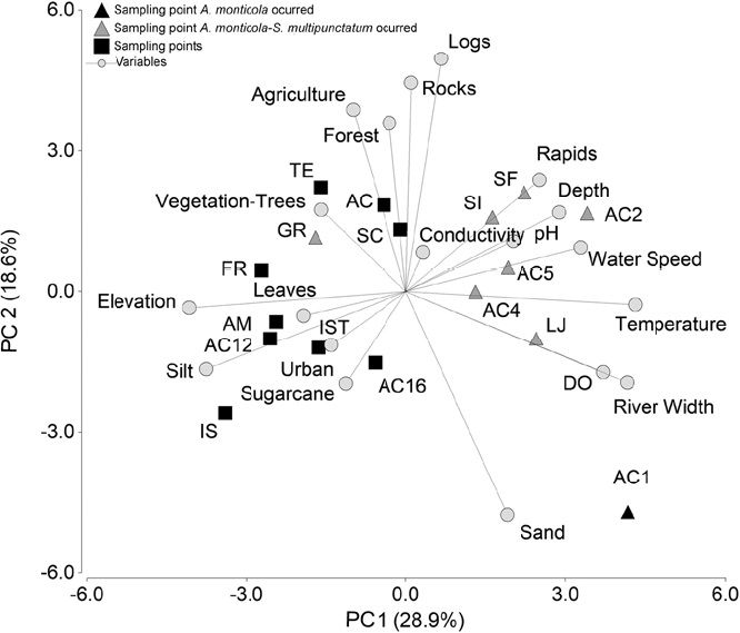 Environmental variables of the sites where the species occurred presented particular traits. The first 2 components of the PCA explained 47.50% of variance (Table 2, Fig. 4). The sites where either A. monticola or S. multipunctatum or both occurred were located in the main channel and in the tributary rivers at low elevations (19-137 m asl) and were characterized by physicochemical variables that include higher water temperatures and dissolved oxygen, and deeper and wider areas with high current speed (Table 2, Fig. 4). Complementary to these traits, the fish preferred areas that presented high cover of rock and logs and in sites where sampling points were surrounded by forest and agricultural areas. The sampling points where A. monticola and S. multipunctatum did not occur were located at elevations between 267-509 m asl and had lower temperatures, lower dissolved oxygen values, and the rivers were narrow and shallow. Usually the substratum in these areas was dominated by silt and sand and bordered by urban areas, sugarcane crops, and scattered trees. The only sampling point that had these conditions with the presence of A. monticola and S. multipunctatum was the Grande River (GR) at 325 m asl but the abundance of fish was low (3 and 8 individuals, respectively).