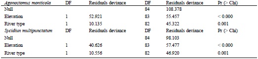 A general linear model was constructed for the abundance of each species (A. monticola and S. multipunctatum) using a negative binomial distribution and Log link function. To select the best model, a step wise process was performed using the Akaike information criterion (AIC) (Agresti, 1996; Anderson et al., 1994, 2000) and the delta AIC (∆) in order to compare and discriminate among models (Anderson et al., 2000, 2001; Burnham & Anderson, 2003). The final model: abundance = altitude + river type, presented the best approximation to the observed abundance pattern and the significance of each main effect was tested with a X 2 test. To assess if the length of the fish was related with altitude, a Pearson correlation test was performed using the standard length of both A. monticola and S. multipunctatum, and the altitude. In order to test if the length distribution of each A. monticola and S. multipunctatum differed between the tributaries and main channel of the Acahuapa River watershed, a 2 sample Kolmogorov-Smirnov goodness of fit test was performed. The test quantifies a distance between the empirical distributions of the 2 samples assuming that the samples are drawn from the same distribution essentially comparing the shape of those distributions. These analyses were performed in the Statistical Package R (R Core Team, 2013).