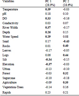 The environmental conditions of the sampled sites where A. monticola or S. multipunctatum occurred were assessed via principal components analysis (PCA) in order to detect habitat conditions preferred by the fish. The variables included in the analysis were temperature (ºC), conductivity (µS/cm), dissolved oxygen (mg/l), pH, current speed, river width and depth, the bottom structure (rocks, sand, logs, silt and leaves), habitat traits (rapids, waterfalls, erosion, vegetation, trees), and landscape variables around the river; urban areas, forest, sugar cane, crops, and agriculture (grassland, corn, beans, sorghum, etc.). All the data from these environmental variables were standardized (centering and scaling) to reduce the effect of the measurement units in the PCA. For habitat traits (rapids, waterfalls, erosion, vegetation, trees) that were described as absence and presence (0-1), a principal coordinates analysis (PCoorA) was performed to represent binary variables and transform them into quantitative variables expressed on 2 axes (PCoorA1 and PCoorA2). A logistic regression analysis was performed between the environmental variables and the values of PCoorA1 and PCoorA2 to identify the variables that best described the contribution of the 2 PCoorA axes. Only the variables with statistical significance p > 0.05 were described in the PCA. To select the number of interpretable axes in the PCA the broken stick model was computed. The PCA components that were interpreted were those whose eigenvalues were larger than the length of the corresponding piece of the broken stick model. The analyses were performed with the R and InfoStat (Di Rienzo et al., 2011) statistical packages.
