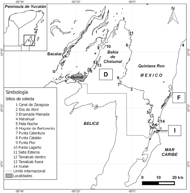El estudio se llevó a cabo en la bahía de Chetumal/Corozal y la costa sur del Caribe mexicano de Mahahual a Xcalak, en 14 localidades. Éstas se clasificaron en 3 zonas: bahía o zona dentro (D), canal de Zaragoza o zona intermedia (I) y laguna arrecifal o zona fuera (F) (Fig. 1).