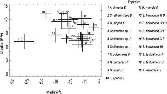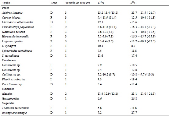 Con las proporciones de cada elemento se realizaron sendos Anova de una vía (zona, F, D o I) para la mayoría de los taxones y de 2 vías (sitio y clase de talla) para la barracuda, previa comprobación de homoscedasticidad y normalidad (programa Statgraphics vers. 5.0.1.0: StatPoint Technologies, 2010). La expectativa era reconocer una firma isotópica de δ13C correspondiente a la bahía, a partir de las hojas de R. mangle allí recolectadas, y otra correspondiente al mar Caribe adyacente, con la obtenida de T. testudinum. Con la señal δ15N se caracterizó el nivel trófico de los organismos, como un dato adicional para distinguir el uso de recursos tróficos por parte de las barracudas según la talla y hábitat. Los resultados se representaron mediante gráficas δ13C vs. δ15N.