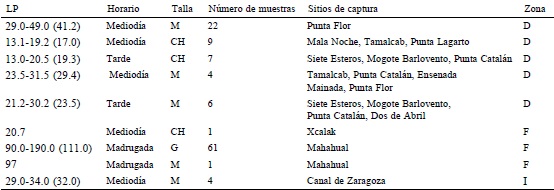 Se capturaron 116 especímenes de barracuda, de los cuales 18 se clasificaron como chicos, 37 medianos, y 61 grandes. Los organismos grandes sólo se registraron en la zona F, y en la zona I sólo hubo ejemplares medianos; las tallas chicas y medianas predominaron en la zona D, aunque también se encontraron en la F (Tabla 1). Además, se obtuvieron 45 muestras de peces (sin contar S. barracuda), crustáceos y moluscos, así como 2 muestras vegetales, R. mangle en el interior de la bahía de Chetumal y T. testudinum en Mahahual (Tabla 2).
