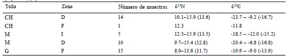 La firma isotópica de δ13C reflejó también diferencias entre las distintas tallas de barracuda y los sitios en que fueron capturadas, formando así 3 subpoblaciones (Fig. 3). Las de talla grande de la costa del Caribe (zona F) y canal de Zaragoza (zona I) estuvieron menos enriquecidas en δ13C en comparación con las chicas y medianas de adentro de la bahía (zona D). En la bahía (zona D), las barracudas chicas reflejaron un δ15N muy similar a las de la talla mediana (Fig. 3) y cercano al de Achirus lineatus (Fig. 2). En la zona F, la señal de δ15N fue más alta en los organismos de menor talla que en los grandes; sin embargo no se observó traslape en la señal de δ13C, lo que sugiere que cada grupo se alimenta en sitios distintos (Fig. 3).