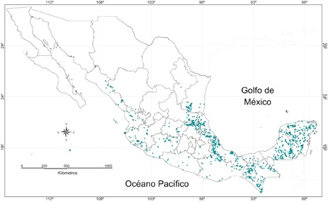 Para el índice de rareza, criterio A, características de la distribución geográfica se obtuvieron los siguientes valores: 1) extensión de la distribución: el porcentaje de la superficie nacional se obtuvo considerando la superficie de los tipos de vegetación en los que coinciden las localidades de colecta de la especie; se utilizaron 4 mapas digitales de uso de suelo y vegetación de 3 diferentes escalas (Tabla 4). La extensión de distribución calculada presentó un intervalo de 9.80 a 27.47 % de la superficie nacional, considerando exclusivamente la distribución dentro de tipos de vegetación (excluyendo hábitats no adecuados) el intervalo de distribución va de 5.58 a 18.57%; de acuerdo al MER, los 4 casos corresponden con el inciso “d” que considera un intervalo mayor de 5% y menor o igual al 40 % del territorio nacional, por lo que se le asigna un valor de 1 punto; 2) número de poblaciones o localidades conocidas existentes: en un mapa de escala 1: 4,000,000 se pueden distinguir claramente 815 localidades, coincidentes con el apartado “d” que considera un número mayor o igual que 26, asignando un valor de 0 puntos (Fig. 1); 3) número de provincias biogeográficas en las que se encuentra el taxón: conforme al mapa de provincias biogeográficas de México (Conabio, 1997), las localidades de colecta coinciden con 14 diferentes provincias biogeográficas (Altiplano sur (Zacatecano-Potosino), Costa del Pacífico, Depresión del Balsas, Eje volcánico, Golfo de México, Los Altos de Chiapas, Oaxaca, Petén, Sierra Madre del Sur, Sierra Madre Occidental, Sierra Madre Oriental, Soconusco, Sonorense y Yucatán). El valor asignado es de 0 puntos correspondiente al inciso “d” (mayor o igual que 6 provincias); 4) representatividad de la distribución del taxón en el territorio mexicano: Cedrela odorata es una especie neotropical cuya distribución más septentrional corresponde al norte de México y su límite meridional es el norte de Argentina (incluyendo las islas del Caribe), por lo que su distribución para México es considerada como no periférica o extralimital y el valor asignado es de 0 puntos.