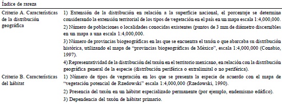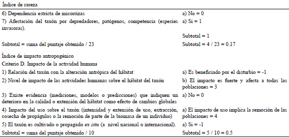 El método se fundamenta en 2 índices, el índice de rareza (IR) y el índice de impacto antropogénico (IIA), ambos incluyen criterios independientes, que se ponderan asignando valores ascendentes de riesgo los cuales se suman para obtener una evaluación acumulativa de riesgo (Tabla 1).