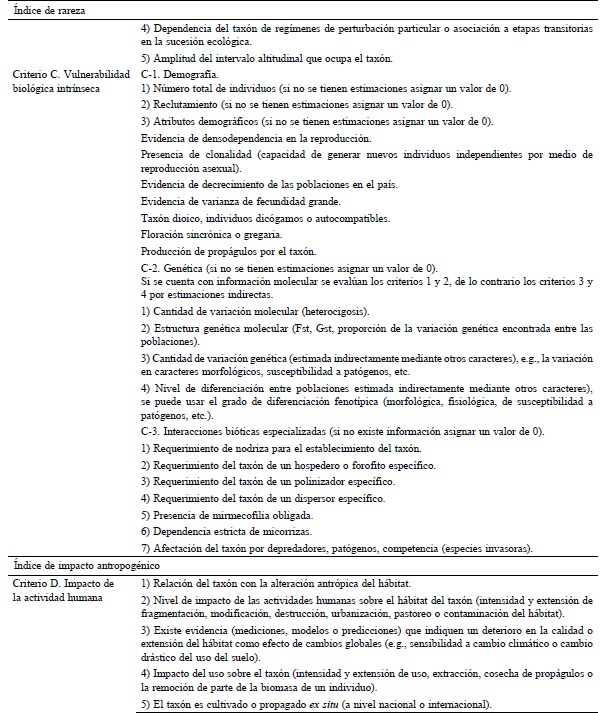 El IR incluye la evaluación de 3 criterios: las características de la distribución geográfica, las características del hábitat y la vulnerabilidad biológica intrínseca de la especie (considera las propiedades demográficas, genéticas y las interacciones bióticas especializadas [Tabla 1]). El IIA se determina con el criterio D, que evalúa el impacto de la actividad humana sobre el hábitat del taxón, su uso y tipo de propagación (Tabla 1). Cada uno de los criterios contenidos en los 2 índices (IR e IIA) tiene la misma ponderación, siendo el valor máximo de cada uno de ellos igual a 1 y se obtiene mediante una normalización del puntaje máximo del criterio. Las categorías de riesgo se establecen de acuerdo con el puntaje obtenido en el cálculo del índice MER y vías directas particulares de algún criterio calculado (Tabla 2); jerárquicamente, las categorías de riesgo son: en peligro de extinción (P), amenazada (A) y sujeta a protección especial (Pr) (Semarnat, 2010).