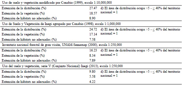 Analizando algunos aspectos metodológicos del MER-Plantas, la inclusión de la cartografía digital como fuente de información temática que asigna información a los registros de presencia de la especie, es un avance metodológico importante que ha transformado parte del método en un proceso cuantitativo. Para especies de amplia distribución en el país, es recomendable emplear cartografía digital de uso de suelo y vegetación actualizada como la serie V de Inegi (2013), que provee información actualizada sobre la distribución de la vegetación en el territorio, además la información contenida en esta serie se generó en escala grande o de mayor detalle (1:250,000) en comparación con otros mapas (escala 1:4,000,000) que se emplean en diferentes cálculos del índice.