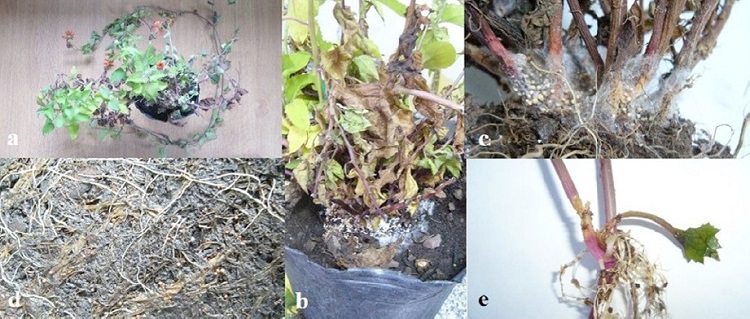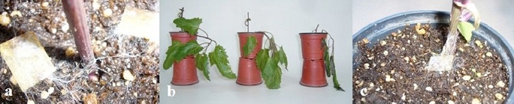 Two days after inoculation, hyphal strands emerged from the plugs and grew towards the substrate and the base of the plants (Fig. 3a), which gradually withered (Fig. 3b). The lower stems appeared surrounded by pathogen’s hyphae (Fig. 3c), and showed water-soaked lesions 5 days from inoculation. All the inoculated plants died within 2 weeks, while the controls remained healthy.