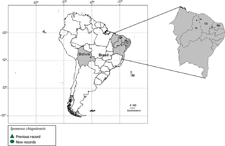 Ipomoea chiquitensis is a recently described species from Bolivia, and is considered endangered (Wood et al., 2015). During an ongoing project to improve the knowledge of Convolvulaceae from Brazil, we made field expeditions in the Brazilian northeast region between 2015 and 2016, when we collected a specimen that we came to conclude belonged to this species. It is the first record of I. chiquitensis for Brazil. More extensive study of herbarium collections revealed that this species is more frequent than initially thought in Brazil, only its specimens have been identified in herbaria as other species of Ipomoea.