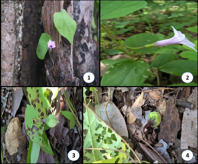 Description. Herbaceous vine, branches sparsely hirsute, internodes 2-15.5 cm long. Leaves simple, 1.8-6 × 3-6.5 cm, cordiform, the margin entire, the base cordate, the apex acuminate to cuspidate, mucronulate, blades discolorous, herbaceous, abaxial surface glabrous, adaxial surface sparsely hirsute; venation brochydodromous, with 5-6 pairs of secondary veins and white dots along the veins on the abaxial surface. Petiole 2-5 cm long, hirsute. Inflorescence 1-floral, axillary, peduncle 3-6 mm long, hirsute; pedicel ca. 9 mm long, glabrescent, bracteole ca. 1 mm long, lanceolate, glabrous. Calyx with sepals subequal, the outer ones 5-6 x 2 mm, oval to lanceolate, margin entire, the base truncate, the apex acute to acuminate, glabrescent, the inner ones 4-5 × 2.5-3 mm, oval, margin hyaline, the base truncate, the apex acute, glabrous. Corolla 1.7-1.8 cm long, funnelform, glabrous, pink to lilac. Stamens inserted; filaments 3.5-6 mm long, with short trichomes at the base anthers 1.2 mm long, the base sagittate, apex obtuse, white; Gynoecium inserted; ovary ca. 1 mm long, conical, glabrous, 2-loculate, 2 ovules per locule; style ca. 7 mm long; stigmatic lobes verrucate, papillose. Fruit ca. 9 mm long, ovoid, glabrous. Seeds not observed. (Figs. 2, 3).
