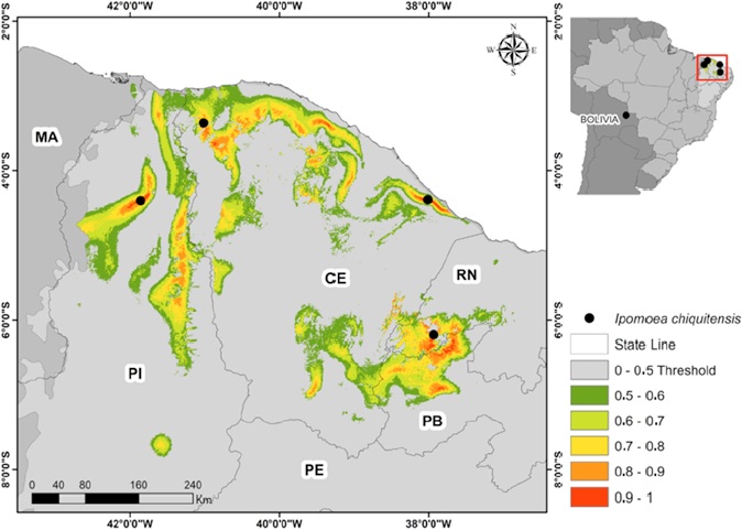The evaluation of the potential distribution of Ipomoea chiquitensis showed that it may occur in other areas of the northeast region of Brazil, because the results indicate the areas that are favorable to the occurrence of the taxon. The environmentally adequate area of the species from the model was 70594.97 km², equivalent to 8.53% of the background (Fig. 4). Overall, the discovery of the new records of I. chiquitensis come to support the already suggested relationship between the flora of Chaco and Caatinga (Buril et al., 2014), and highlights the importance of improving investigations of the Convolvulaceae in savannah vegetation of the Brazilian northeast.