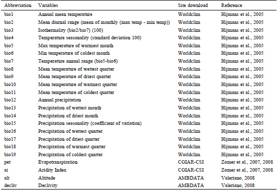 For modeling, we collected 23 environmental layers with spatial resolution of 1 km2 (Table 1) and we selected predictors of environmental variables through principal component analysis (PCA). For that, we obtained the data of the 23 environmental variables in each pixel of the background (Caatinga), using the geographic information systems (GIS) software QGIS. For each PCA component we selected a predictor, one that maximized the percentage explained by the component (Table 2). The predictive variables selected by the PCA were: average temperature of the coldest quarter (bio11), annual precipitation (bio12), precipitation seasonality (bio15), and aridity index (ia). To compute the PCA we used the software R (R Core Team, 2016), Vegan package. We chose the environmental distance- DOMAIN algorithm (Carpenter et al., 1993) for the construction of our models. The models were computed in Open Modeller 1.1 software (Muñoz et al., 2011). We used the binomial test to evaluate the performance of independent models (Pearson et al., 2007). The binomial test was performed in BioEstat 5.0 software (Ayres et al., 2007).