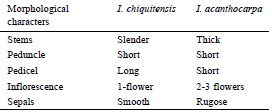 Note. Specimens of Ipomoea chiquitensis have been identified as I. acanthocarpas (Choisy) Aschers & Schweinf. due to the very short corolla. However, I. chiquitensis can be easily distinguished by its slender stems, herbaceous leaves, short peduncle, long pedicel, inflorescence reduced to one flower, and smooth sepals (Table 3). Ipomoea chiquitensis occurs in Bolivia (Wood et al., 2015) and in the Brazilian northeast, where it grows in sandy soils, mostly disturbed areas, and in shaded sub-deciduous forest borders. This habitat is different from the type locality in Bolivia, where the species grows on islands of vegetation over rocky soils. This disjunct distribution between Caatinga and Chaco has been reported for other species of Convolvulaceae (Buril et al., 2014). Wood et al. (2015) categorized the species as critically endangered (CR). The new records from the Brazilian northeast change its status and here we categorize it as endangered (EN), according to the IUCN criteria.