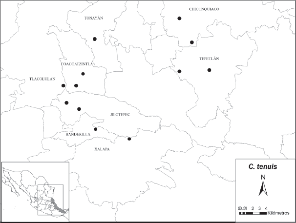 Los patrones de variación morfológica observados en campo muestran que Ceratozamia tenuis es endémica de la región montañosa central de Veracruz, comprendida entre los municipios de Banderilla, Xalapa, Jilotepec y Coacoatzintla en el extremo sur y, Tepetlán y Chiconquiaco en el extremo norte (Fig. 1). La especie habita en bosque mesófilo de montaña sensuRzedowski (1978), sobre laderas escarpadas en un rango de elevación de 1,200 hasta 1,850 m de altitud en suelos de origen volcánico. En relación a las provincias biogeográficas, la especie se encuentra en la zona de transición entre la Sierra Madre Oriental y el Eje Neovolcánico Transversal Mexicano.