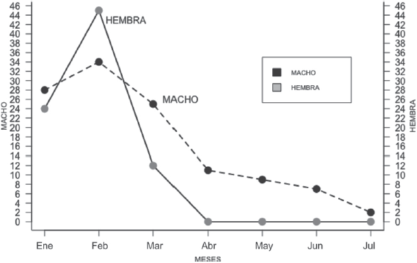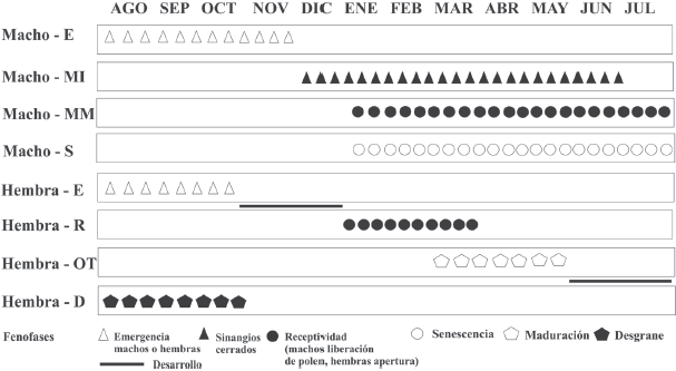 Considerando la fase de liberación de polen del estróbilo polinífero y la receptividad del estróbilo ovulífero, la sincronía reproductiva entre plantas poliníferas y ovulíferas a nivel poblacional es parcial. Dicha congruencia entre las ontogenias de los 2 sexos ocurre de enero a marzo, teniendo como punto máximo febrero. Sin embargo, la producción de polen continúa hasta julio, cuando ya no hay plantas ovulíferas receptivas (Fig. 4).