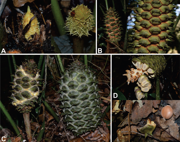 La fase OT inicia en marzo y finaliza en julio. Durante los primeros meses del desarrollo de los óvulos, el color de la sarcotesta se mantiene de color amarillo verdoso (Figs. 4, 5C). Conforme pasan los meses la sarcotesta se vuelve opaca y el extremo distal de las megasporófilas puede tornarse café. Por su parte, la fase D ocurre de agosto a octubre, y se caracteriza por el desprendimiento de las megasporófilas y los óvulos del eje central del estróbilo (Fig. 5D).