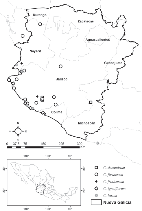 Se registraron 5 especies para el género Combretum en el occidente de México (Fig. 2), una de las cuales pertenece al subgénero Cacoucia (C. decandrum) y 4 al subgénero Combretum (C. farinosum, C. fruticosum, C. igneiflorum y C. laxum). Solo se registró una especie endémica a México (C. igneiflorum). Dentro del área de estudio se encuentra la mayor parte de las especies del género conocidas en este país (71%), ya que sólo se distribuyen fuera del occidente de México C. argenteum Bertol. (en Chiapas, Oaxaca y Centroamérica) y C. rovirosae Exell (en Campeche, Chiapas, Tabasco, Veracruz y Centroamérica). En todo el país, la especie con mayor amplitud de distribución es C. farinosum, la cual se localiza en 17 estados, en tanto que las más restringidas son C. igneiflorum y C. rovirosae, presentes en 4 entidades, así como C. argenteum, registrada únicamente en 2.