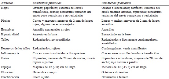 Algunos autores han considerado a Combretum farinosum como sinónimo de C. fruticosum, ya sea en inventarios florísticos (p. ej., Carnevali et al., 2010; Fernández et al., 1998), revisiones florístico-taxonómicas (Pagaza-Calderón y Fernández-Nava, 2005; Williams, 1961) o en estudios ecológicos (Gryj et al., 1990). Al respecto, Stace (2009a, 2009b) mencionó que es factible separar a estas dos especies basándose en las escamas blancas que dan el color a las hojas, inflorescencias y flores de C. farinosum, en contraparte a las escamas amarillo doradas de C. fruticosum, así como otros caracteres florales. En el presente estudio se tomó en cuenta lo anterior, ya que en las poblaciones del occidente de México lo más conspicuo para distinguir ambas especies es el color las flores, que pasan de amarillo anaranjado a rojo en C. farinosum, mientras que en C. fruticosum son amarillas. Otras características distintivas se indican en las Tablas 1 y 2.