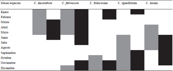 Los datos de fenología obtenidos de ejemplares de herbario se consideran una fuente válida para caracterizar estos atributos (e.g., Borchert, 1996; Davis et al., 2010; Du et al., 2015). Tomando en cuenta lo anterior, los resultados de la Tabla 2 sugieren diferencias fenológicas entre especies, ya que dos de ellas florecen durante la época seca (C. decandrum y C. farinosum), otra desde mediados de ésta hasta inicios de la época de lluvias (C. laxum), mientras que las otras dos se registran durante la época de lluvias (C. fruticosum y C. igneiflorum). La temporalidad de estas fenofases concuerda con lo documentado para especies presentes en el bosque tropical caducifolio de Chamela, en Jalisco (Bullock y Solís-Magallanes, 1990). Respecto a la fructificación, en general se observa que los frutos maduros de todas las especies se registran hacia finales de la época de lluvias y durante la época seca (noviembre a junio), lo que sugiere que las diásporas permanecen en el suelo durante los meses de menor precipitación y posiblemente germinen durante la época de lluvias. Con base en los datos de todas las especies estudiadas, la fructificación se registra a lo largo de todo el año. La confirmación de lo descrito previamente requiere de estudios más detallados de fenología, dispersión y germinación de las especies en el área de estudio.