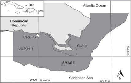 The SMASE is formed by a reef system located near the SE part of the island Hispaniola (SINAP, 2014), between 18°22’9” - 18°11’4” N, 68°51’9” - 68°38’15” W (Fig. 1). This region is part of the Central Province of the Greater Caribbean; the area is located between Saona Island in the Cotubanama National Park and east of Puerto Rico, where the Mona Passage is located (Geraldes & Vega, 2004). This area is characterized by shallow sand banks, meadows of sea grasses, and coral reefs. To the southeast of Saona Island, there are fringing reefs with a deeper and wider shelf, where beds are mixed with low-lying hard corals and sea grasses (Chiappone, 2001; Vega et al., 1997).