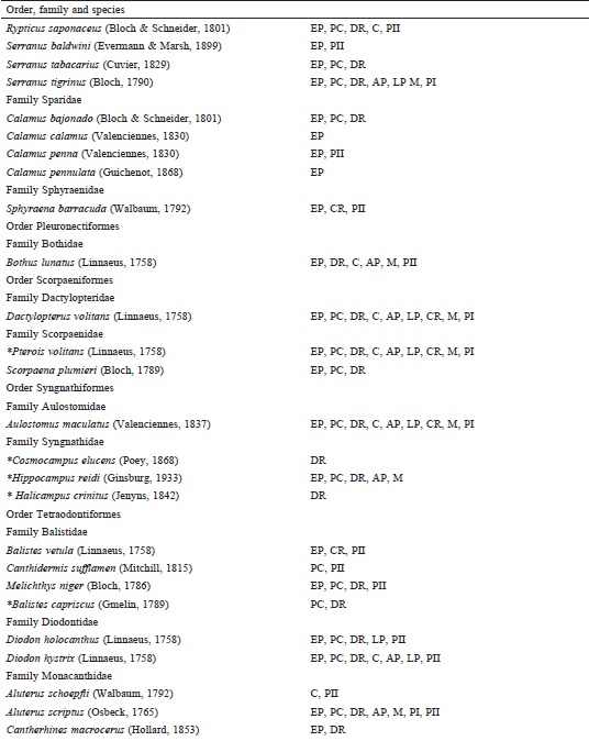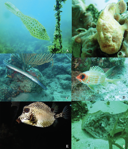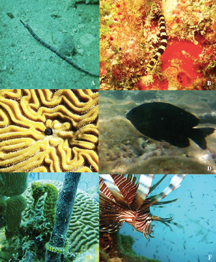 We documented 14 new records for the area of influence of the SMASE (9.4% of the total): Cosmocampus elucens Poey, 1868, Emblemariopsis sp. Longley, 1927, Haemulon parra Desmarest, 1823, Hemiramphus balao Lesueur, 1821, Hemiramphus brasiliensis Linnaeus, 1758, Hippocampus reidi Ginsburg, 1933, Lutjanus cyanopterus Cuvier, 1828, Halicampus crinitus Jenyns, 1842, Mycteroperca bonaci Poey, 1860, Ophioblennius macclurei Silvester, 1915, Seriola dumerili Risso, 1810, Stegastes adustus Troschel, 1865, Balistes capriscus Gmelin, 1789 and Pterois volitans Linnaeus, 1758 (Fig. 4).