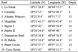 The list of species registered in this work constitutes the first record for the reefs La Pared, Coralina, Atlantic Princess, Magallán, Punta Cacón, and Pepito I and II, all in the SE region of the Dominican Republic.