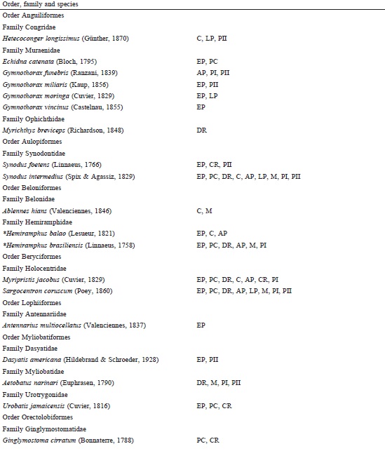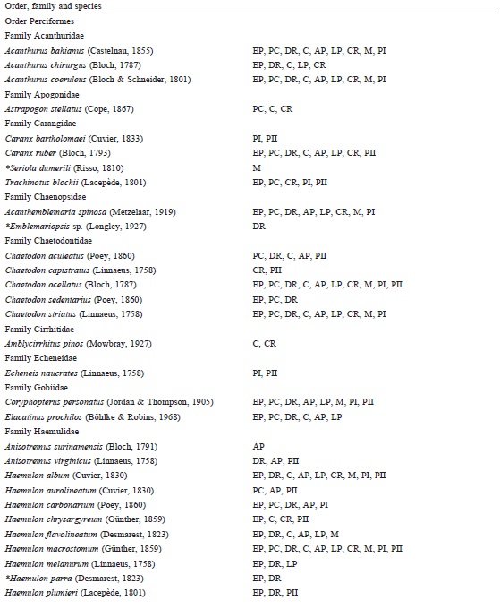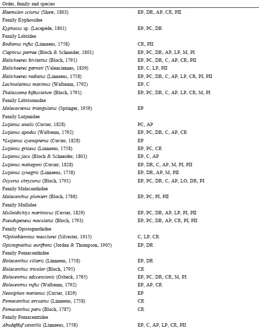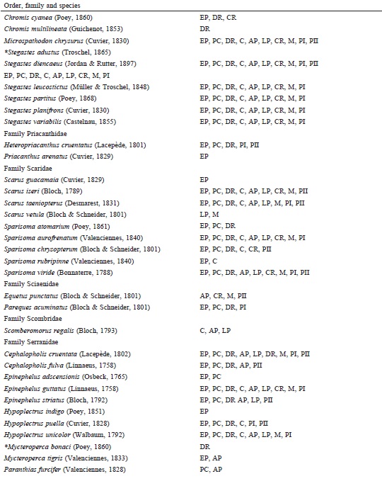 The individuals observed were identified following the Cervigón et al. (1992), Humann and Deloach (2002) and Robertson et al. (2016) identification guides and were systematically ordered according to FishBase criteria (Froese & Pauly, 2016). For interpretation of the biogeographic affinities of the species, analysis of the following regions in Eschmeyer and Fricke’s catalog of fishes (2016) was used: WA = Western Atlantic, EA = Eastern Atlantic, CIRC = Circumtropical, and IS = Invasive species (De Freitas & Lotufo, 2014).