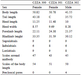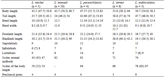 Measurements and scale counts were recorded from specimens that were fixed in 10% formalin and preserved in 70% ethanol. Body and scale measurements were taken with digital calipers to the nearest 0.02 mm. When necessary, a binocular dissecting microscope (10-40X) was used to count and characterize scales. Where bilateral, scale counts and measurements data were taken from the right side of the lizards.