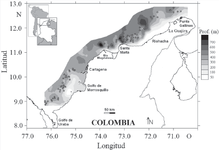 El material fue obtenido en el MCC con pesca de arrastre en profundidades entre 100 y 550 m (ordenados en estratos de profundidad de 100 m) con un mínimo de 2 lances por estrato. Los muestreos se realizaron en agosto y diciembre del 2009 y marzo y mayo del 2010 en 87 estaciones (Fig. 1), con el barco camaronero comercial “Tee Claude” usando una red de arrastre con tamaño de malla al final del copo de 44.5 mm de nudo a nudo. Los fondos propicios para el arrastre fueron determinados usando una ecosonda comercial FURUNO FCV 1150 con un transductor de frecuencia de 28 kHz. La duración de cada arrastre fue de 30 minutos, la distancia arrastrada por la red y la velocidad del barco (2.5 nudos en promedio) fue estimada con un GPS Garmin MAP 76CSx, la abertura de la red fue 11.58 m. La captura de cada arrastre se convirtió en biomasa (kg/km2), mediante el área barrida que se estimó a partir de la abertura de la red y la velocidad del barco (Gunderson, 1993; King, 2007). Debido a las irregularidades del fondo no fue posible colectar muestras entre Cartagena y la desembocadura del río Magdalena.