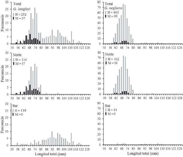 La mayor abundancia de individuos de G. longleyi se evidenció en la zona norte, donde la talla promedio fue de 72.48 mm (LT) y la talla promedio para la zona sur estuvo en 95.31 mm (LT), respectivamente (Fig. 2). En G. neglecta también se presentó mayor abundancia de individuos en la zona norte, donde la talla promedio fue de 70.94 mm (LT) y la talla promedio en la zona sur estuvo en 87.19 mm (LT). En las hembras de ambas especies de camarones aguas profundas se presentaron diferencias significativas entre las tallas por zonas (p < 0.01) (Fig. 2).