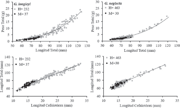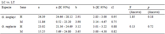 La relación talla-peso mostró diferencias significativas en las hembras de G. longleyi y G. neglecta con respecto al valor de referencia b = 3 (p < 0.05), evidenciando un crecimiento de tipo alométrico positivo (b > 3), donde el peso (PT) incrementa a mayor proporción que la talla (LT), mientras que machos de G. longleyi presentaron isometría (b = 3) (p > 0.05) y los machos de G. neglecta mostraron crecimiento alométrico significativamente negativo (b <3) (p < 0.05). Se encontraron diferencias estadísticamente significativas entre las pendientes de las curvas de crecimiento para hembras y machos de ambas especies de camarones de profundidad (p-Ancova < 0.05) (Tabla 3; Fig. 4). Las relaciones morfométricas entre la LC vs. LT mostraron coeficientes de determinación altos (r2 > 0.75) (Tabla 4; Fig. 4). El Ancova mostró que no hay diferencias estadísticamente significativas entre el paralelismo de las pendientes de las curvas de crecimiento para hembras y machos de ambos camarones de profundidad de la relación lineal (p-Ancova > 0.05) (Tabla 4).