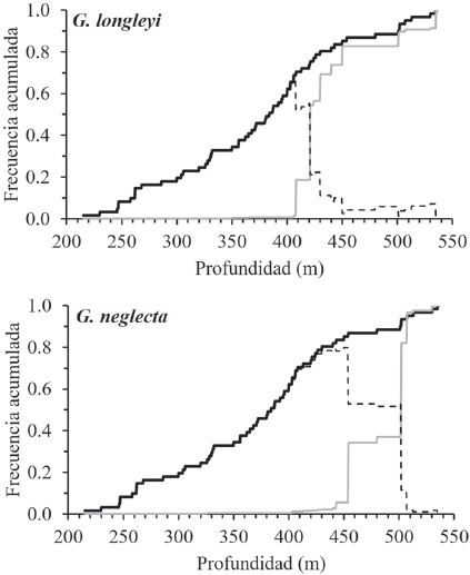 La asociación entre la biomasa de G. longleyi y G. neglecta con la profundidad muestra asociaciones significativas (p < 0.01). Las altas biomasas de G. longleyi se encontraron entre 356 y 420 m, pero con mayores biomasas entre 406 y 407 m. En G. neglecta las altas biomasas se encontraron un poco más profundas, entre 387 y 453.5 m, pero con mayores biomasas entre 450 y 453.5 m (Fig. 5).