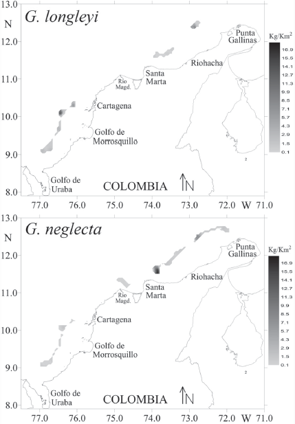 El área noreste del Caribe colombiano está influenciada por los vientos alisios del noreste, los cuales causan un transporte Ekman hacia afuera de la costa, soplando en una dirección sur-oeste, casi paralelos a la costa(Páramo et al., 2003, 2009, 2011); los vientos alisios son responsables de la surgencia que incrementa la productividad en el área de La Guajira (Andrade et al., 2003; Páramo et al., 2003, 2009, 2011). Por esta razón, las mayores agregaciones de G. neglecta se encontraron en el noreste del Caribe colombiano, donde la oceanografía local está modulada por la surgencia estacional de alta productividad (Páramo et al., 2009, 2011). Las mayores biomasas de G. longleyi en la zona sur se distribuyeron entre Cartagena y el golfo de Morrosquillo, donde existe una gran extensión de arrecifes de coral de profundidad que caracteriza el área como altamente productiva, con condiciones de hábitat apropiadas para G. longleyi (López-Victoria y Díaz, 2000). Finalmente, se necesita más información biológica para comprender mejor los parámetros del ciclo de vida de estas especies, tales como crecimiento, épocas de desove, reclutamiento, mortalidad, áreas de desove, áreas de crianza y biodiversidad asociada. Esta información puede ayudar a desarrollar estrategias de protección y conservación del ecosistema en el Caribe colombiano.