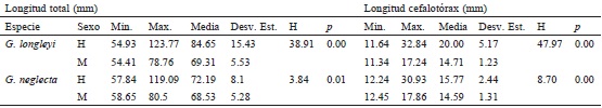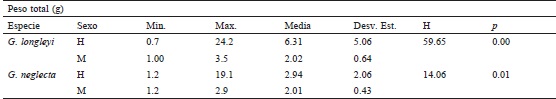 Se observaron diferencias significativas entre los pesos (g) de machos y hembras de los camarones de aguas profundas (p < 0.01) (Tabla 2). La estructura de pesos para las hembras de G. longleyi varió entre 0.70 y 24.20 gramos (peso medio 6.31 ± 5.06 g) y para los machos entre 1 y 3.50 g (peso medio 2.02 ± 0.64 g), mientras que para G. neglecta la estructura de pesos de las hembras osciló entre 1.20 y 19.10 g (peso medio 2.94 ± 2.06 g) y para los machos entre 1.20 y 2.90 g (peso medio 2.01 ± 0.43 g).