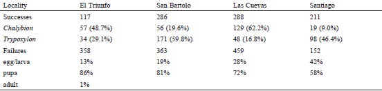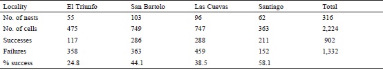 We examined a total of 2,234 cells from at least 316 old nests. Brood success varied widely among localities from 25% (El Triunfo) to 58% (Santiago) (Table 1). At all localities, brood failure was most commonly in the pupal stage (Table 2).