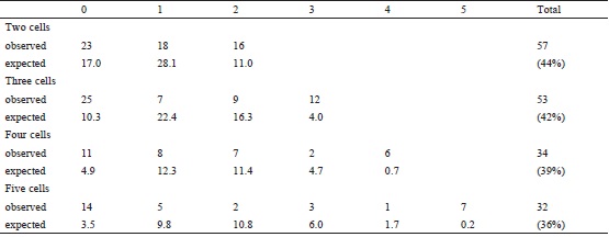 In order to test the hypothesis of a clumped distribution of success or failure among nests, we tabulated the expected numbers of successful and failed cells among nests of 2, 3, 4 and 5 cells, given random distribution of successes.