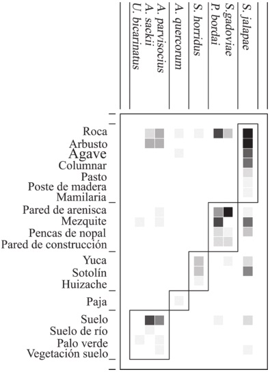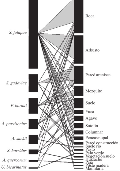 La red obtenida muestra un patrón asimétrico en la especialización de las asociaciones de los lacertilios con los sustratos (Fig. 3). Los resultados indican que la especie que se presentó con mayor frecuencia en los sitios visitados (S. jalapae), mostró un comportamiento generalista con relación a los sustratos utilizados, mientras que otras especies tuvieron preferencias más específicas (Fig. 2). Sceloporus jalapae es una especie de lacertilio terrestre que puede explotar diferentes tipos de sustrato para llevar a cabo sus actividades. Sin embargo, los resultados muestran que a pesar de utilizar hasta 14 tipos de sustrato (Fig. 2A), los individuos de la especie presentan una interacción mayor con los arbustos y las rocas, y en menor grado con el pasto o las mamilarias (Fig. 2B). Es común en regiones de pendiente baja y es abundante debajo de los arbustos y en la base de diferentes plantas de tronco alto (Canseco-Márquez y Gutiérrez-Mayén, 2006; González-Espinoza, 2006).