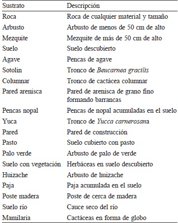 Los muestreos se realizaron mensualmente, de noviembre de 1997 a noviembre de 1998, en 8 sitios elegidos al azar en el valle de Zapotitlán Salinas, con una superficie de 2 ha cada uno (Fig. 1). La búsqueda de los organismos se llevó a cabo en los 8 sitios, con la participación de 3 personas, durante 2 horas, entre las 9:00 y 14:00 h. En cada sitio se registró el número de especies encontradas, el número de individuos por especie y el sustrato sobre el cual fueron observados por primera vez (Tabla 1).