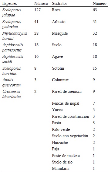 Durante la realización del estudio, se observaron 8 de las 15 especies de lacertilios que han sido registradas en la zona de estudio (Canseco-Márquez y Gutiérrez-Mayén, 2006), repartidas en 19 sustratos (Tabla 2).