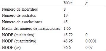 Los valores de especialización, son congruentes con los valores de generalidad (4.98) y de vulnerabilidad (2.28), que representan la media de asociaciones efectivas por lacertilio y por sustrato, respectivamente (Blüthgen et al., 2008; Morris et al., 2014). La generalidad indica que los lacertilios pueden elegir varios sustratos, mientras la vulnerabilidad sugiere que los sustratos, son seleccionados por pocas especies.
