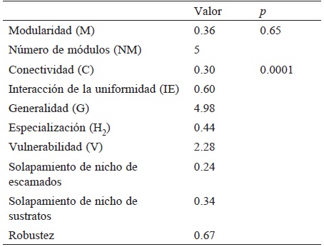 La modularidad se calculó mediante el índice M (intervalo: 0-1) con base en el algoritmo de Newman y Girvan en el programa MODULAR (Marquitti et al., 2014) y su nivel de significancia se calculó utilizando 1,000 iteraciones, con el método de Monte Carlo.